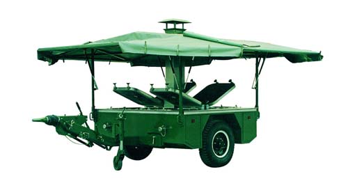 DES-250T is designed to cook for 250 persons of military troops, construction teams and civilians under field conditions. It is equipped with two kettles, two frying pans, two diesel furnaces and other 35 pieces of small kitchen utensils and tools necessary for operation. Diesel oil, wood, coal or natural gas can be used to heat the furnace. The kitchen can be towed under field conditions by trucks or cars. Covers of the side cases are made of acid-resistant steel, thus allowing various operations while preparing the meals. Standard equipments of the kitchen includes a tent enabling operation of the kitchen under any weather conditions and protecting the kitchen and the operating personnel.